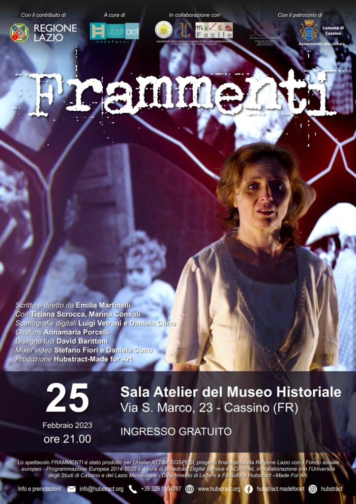 FRAMMENTI DI MEMORIA è realizzato, grazie al contributo della Regione Lazio, a cura di Hubstract – Made for art, con il patrocinio del Comune di Cassino – Assessorato alla Cultura e dell’Università degli studi di Cassino e del Lazio meridionale – Delega rettorale per la Diffusione della cultura e della conoscenza- SCIRE, in collaborazione con il Laboratorio Museo Facile del Dipartimento di Lettere e Filosofia della stessa Università di Cassino.