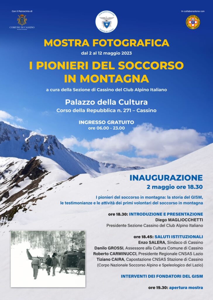 Martedì 2 Maggio ore 18:30, fino al 12 maggio, presso Il Palazzo della Cultura Cassino, MOSTRA FOTOGRAFICA “I PIONIERI DEL SOCCORSO IN MONTAGNA”, a cura della sezione di Cassino del Club Alpino Italiano.