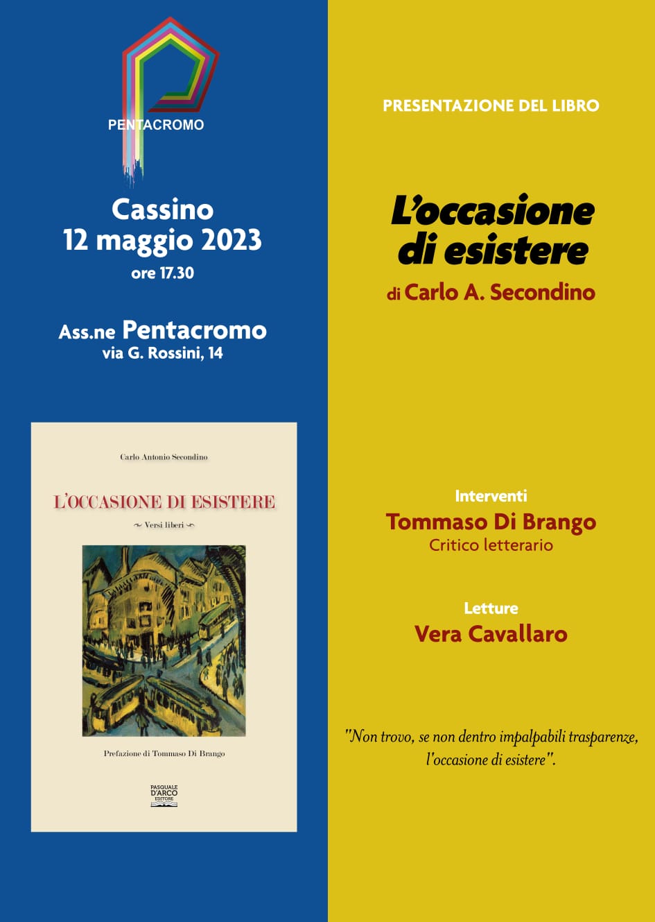 VENERDÌ 12 MAGGIO alle 17:30 presso Pentacromo Cassino appuntamento attesissimo con uno scrittore straordinario, CARLO SECONDINO, che presenterà il suo libro: “L’occasione di esistere“.