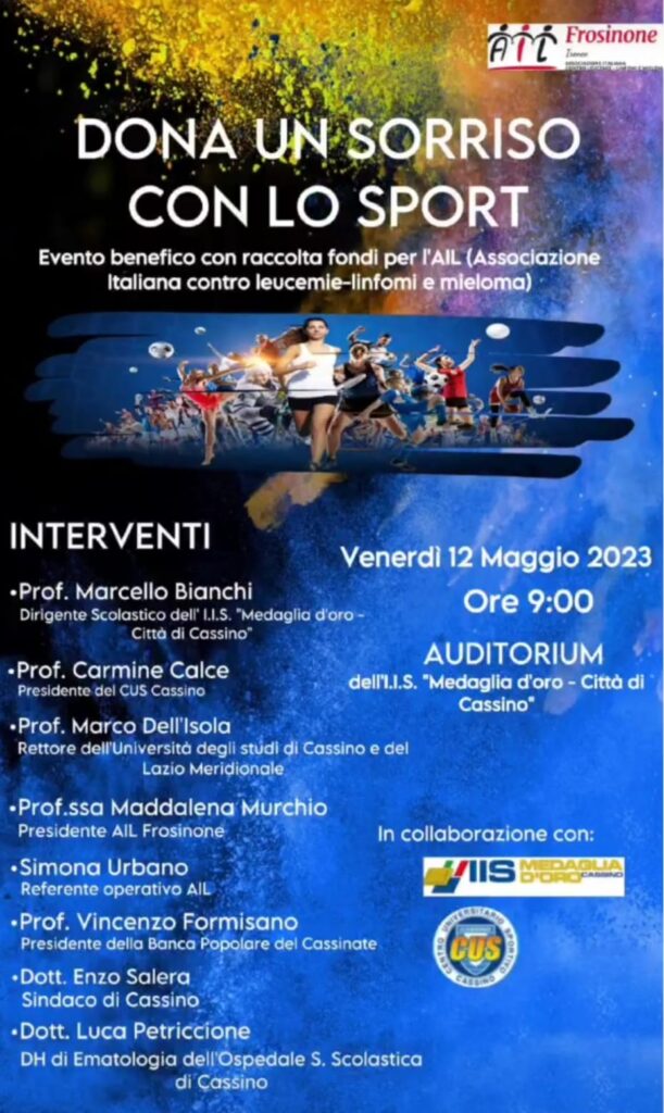 VENERDÌ 12 MAGGIO ore 9:00 presso l’AUDITORIUM dell’ I.I.S. “Medaglia d’oro- Città di Cassino”, si terrà l’evento benefico “DONA UN SORRISO CON LO SPORT“, una raccolta fondi per l’AIL (Associazione Italiana contro Leucemia-linfomi e melanoma). Un evento benefico che invita tutti ad aprire mente e cuore.